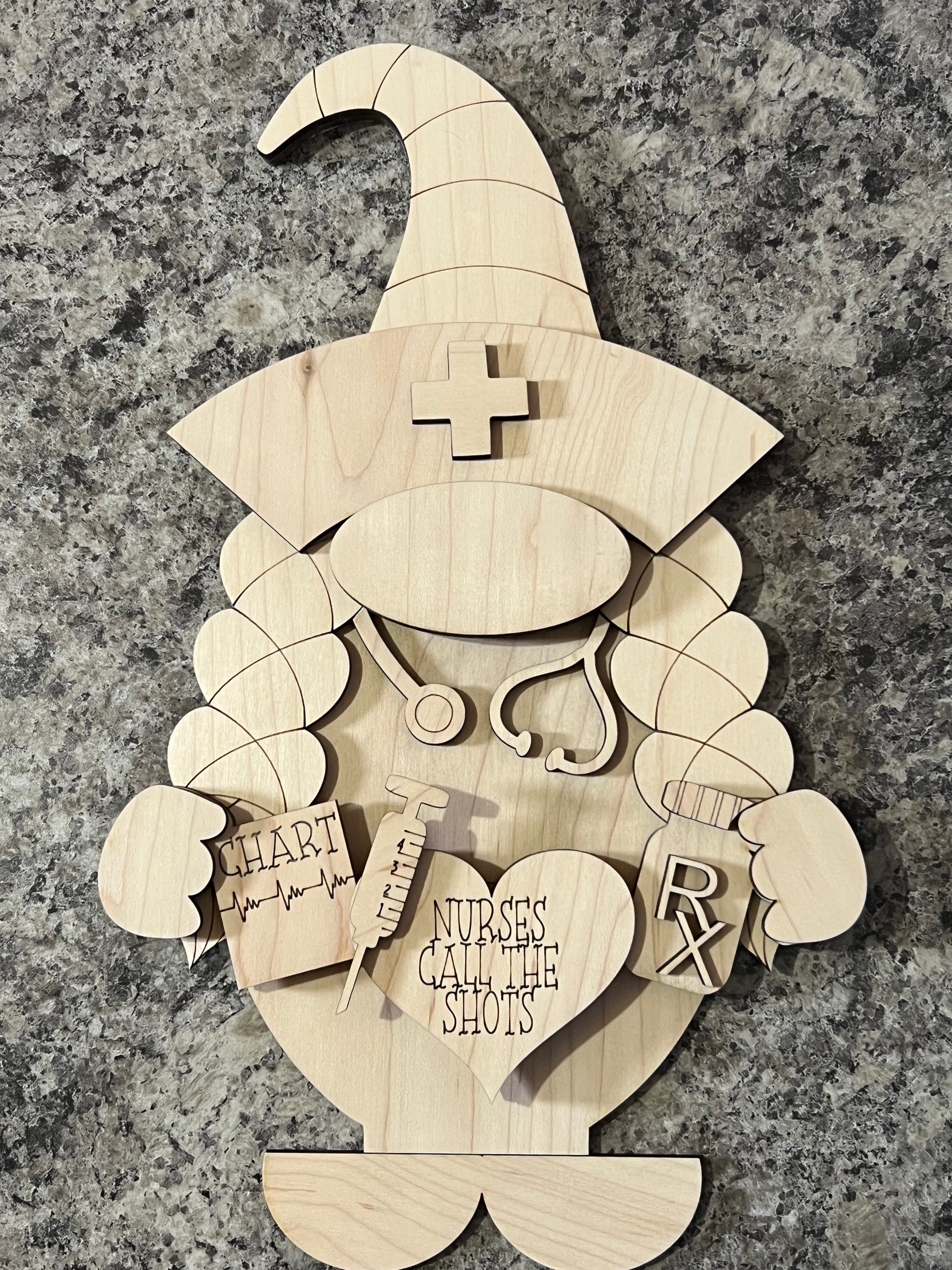 Experience the fun and precision of the crafted Nurse Gnome. Made with laser cut 1/4 maple plywood, each 12" tall piece features 3D pieces for added detail. Easy to assemble and paint, the Nurse Gnome will bring a personal touch to any desk or home. Make it your own!